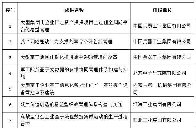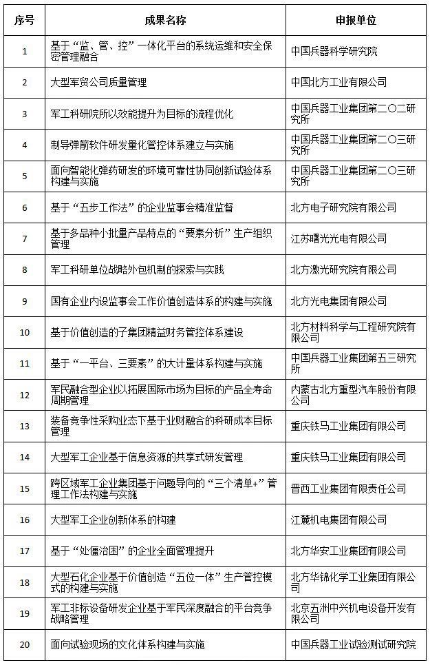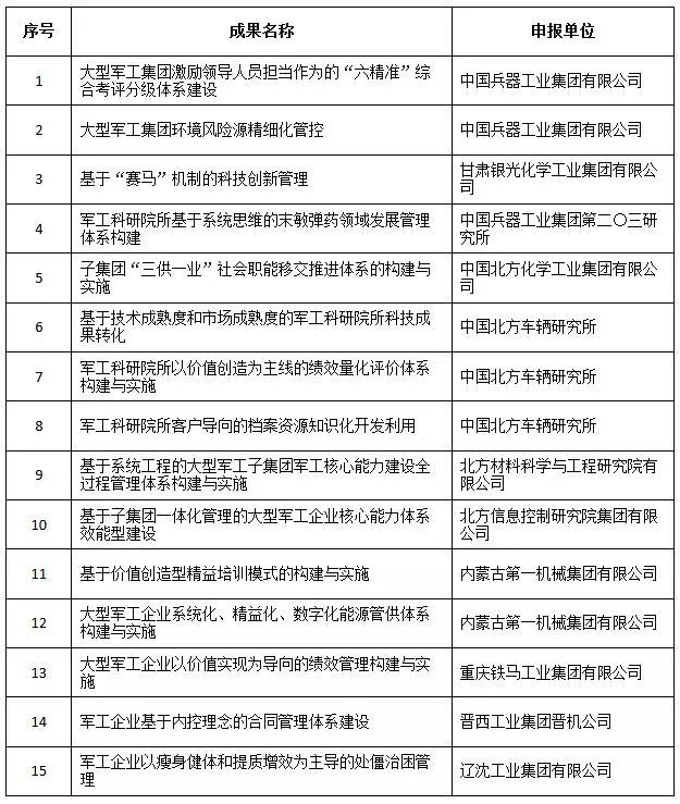 近日,中國兵器工業(yè)集團(tuán)4項(xiàng)創(chuàng)新成果獲全國企業(yè)管理現(xiàn)代化創(chuàng)新成果獎、42項(xiàng)創(chuàng)新成果獲國防科技工業(yè)企業(yè)管理創(chuàng)新成果獎。 全國企業(yè)管理現(xiàn)代化創(chuàng)新成果 經(jīng)全國企業(yè)管理現(xiàn)代化創(chuàng)新成果審定委員會終審,第二十五屆全國企業(yè)管理現(xiàn)代化創(chuàng)新成果公布,中國兵器工業(yè)集團(tuán)4項(xiàng)創(chuàng)新成果榮獲二等獎。 二等獎 國防科技工業(yè)企業(yè)管理創(chuàng)新成果 2018年度國防科技工業(yè)企業(yè)管理創(chuàng)新獲獎成果名單發(fā)布,中國兵器工業(yè)集團(tuán)共獲獎42項(xiàng),其中:一等獎7項(xiàng),二等獎15項(xiàng),三等獎20項(xiàng)。獲獎總量及一等獎數(shù)量均位于軍工集團(tuán)首位。 一等獎 二等獎 三等獎 據(jù)悉,2018年度的國防科技工業(yè)企業(yè)管理創(chuàng)新評審工作,經(jīng)專家初審、函審、一等獎候選成果答辯、專家會議評審、評審委員會審核并公示后,評選出一批在履行強(qiáng)軍首責(zé)、全面貫徹創(chuàng)新驅(qū)動發(fā)展戰(zhàn)略和全面深化改革、高質(zhì)量發(fā)展等方面的優(yōu)秀成果。本年度共確定獲獎成果307項(xiàng),其中一等獎44項(xiàng),二等獎126項(xiàng),三等獎137項(xiàng)。 |