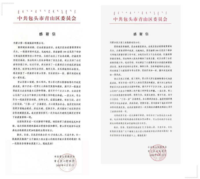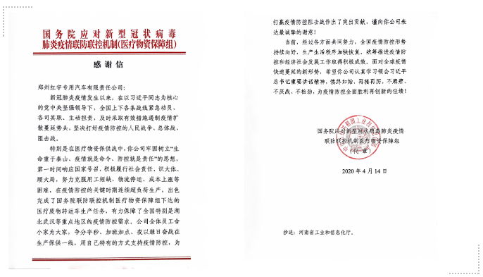 近日,中國兵器工業(yè)集團(tuán)豫西集團(tuán)鄭州紅宇專汽公司、一機(jī)集團(tuán)和北重集團(tuán)分別收到國務(wù)院應(yīng)對新型冠狀病毒肺炎疫情聯(lián)防聯(lián)控機(jī)制醫(yī)療物資保障組,包頭市青山區(qū)委、區(qū)政府發(fā)來的感謝信、慰問信,對他們在打贏疫情防控人民戰(zhàn)爭、總體戰(zhàn)、阻擊戰(zhàn)中作出的貢獻(xiàn)表示感謝。 豫西集團(tuán)鄭州紅宇專汽公司收到國務(wù)院聯(lián)防聯(lián)控機(jī)制感謝信 4月14日,國務(wù)院應(yīng)對新型冠狀病毒肺炎疫情聯(lián)防聯(lián)控機(jī)制醫(yī)療物資保障組向中國兵器工業(yè)集團(tuán)豫西集團(tuán)鄭州紅宇專汽公司發(fā)來感謝信。 豫西集團(tuán)鄭州紅宇專汽公司收到國務(wù)院應(yīng)對新型冠狀病毒肺炎疫情聯(lián)防聯(lián)控機(jī)制醫(yī)療物資保障組發(fā)來的感謝信 信中指出,新冠肺炎疫情發(fā)生以來,在以習(xí)近平同志為核心的黨中央堅強(qiáng)領(lǐng)導(dǎo)下,全國上下各條戰(zhàn)線緊急動員、各司其職、主動擔(dān)責(zé),及時采取有效措施遏制疫情擴(kuò)散蔓延勢頭,堅決打好疫情防控的人民戰(zhàn)爭、總體戰(zhàn)、阻擊戰(zhàn)。 特別是在醫(yī)療物資保供戰(zhàn)中,鄭州紅宇專汽公司牢固樹立“生命重于泰山、疫情就是命令、防控就是責(zé)任”的思想,第一時間響應(yīng)國家號召,積極履行社會責(zé)任,識大體、顧大局,努力克服用工短缺、物流停運(yùn)、成本上漲等困難,在疫情防控的關(guān)鍵時期連續(xù)超負(fù)荷生產(chǎn),出色完成了國務(wù)院聯(lián)防聯(lián)控機(jī)制醫(yī)療物資保障組下達(dá)的醫(yī)療廢物轉(zhuǎn)運(yùn)車生產(chǎn)任務(wù),有力保障了全國特別是湖北武漢等重點(diǎn)地區(qū)的疫情防控需求。公司全體員工舍小家為大家、爭分奪秒、加班加點(diǎn),夜以繼日奮戰(zhàn)在生產(chǎn)保供一線,用自己特有的方式支持疫情防控,為打贏疫情防控阻擊戰(zhàn)作出了突出貢獻(xiàn)。 鄭州紅宇專汽公司緊急生產(chǎn)醫(yī)療廢物轉(zhuǎn)運(yùn)車并及時發(fā)運(yùn) 疫情發(fā)生以來,鄭州紅宇專汽公司已簽約醫(yī)療廢物轉(zhuǎn)運(yùn)車107臺,累計下線90臺,交付83臺。 一機(jī)集團(tuán)和北重集團(tuán)收到中共包頭市青山區(qū)委員會、青山區(qū)人民政府發(fā)來的感謝信和慰問信 4月13日,中共包頭市青山區(qū)委員會、青山區(qū)人民政府向中國兵器工業(yè)集團(tuán)一機(jī)集團(tuán)和北重集團(tuán)發(fā)來感謝信和慰問信,對參與青山區(qū)防控疫情一線工作的一機(jī)集團(tuán)、北重集團(tuán)黨員干部職工及給予充分理解、全力支持的家屬們,表示衷心的感謝并致以最崇高的敬意!