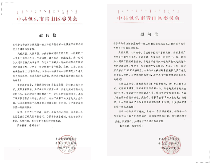 一機(jī)集團(tuán)、北重集團(tuán)收到中共包頭市青山區(qū)委員會、青山區(qū)人民政府發(fā)來的慰問信 信中指出,在青山區(qū)抗擊疫情最緊要的關(guān)頭,一機(jī)集團(tuán)、北重集團(tuán)雪中送炭、迅速響應(yīng),分別緊急抽調(diào)百余名黨員干部參與到地區(qū)疫情防控工作中,為全區(qū)上下眾志成城,打贏疫情防控的人民戰(zhàn)爭、總體戰(zhàn)、阻擊戰(zhàn)增添了寶貴力量,有力支持了全區(qū)疫情防控工作,彰顯了一機(jī)集團(tuán)、北重集團(tuán)在公共危機(jī)面前挺膺負(fù)責(zé)、挺身而出的社會責(zé)任,胸懷大局、無私奉獻(xiàn)的社會擔(dān)當(dāng)。 一機(jī)集團(tuán)黨員干部馳援青山區(qū)疫情防控一線 北重集團(tuán)黨員干部馳援青山區(qū)疫情防控一線 來源/豫西集團(tuán)紅宇專汽公司、一機(jī)集團(tuán)、北重集團(tuán)