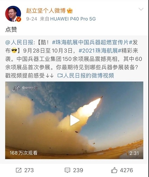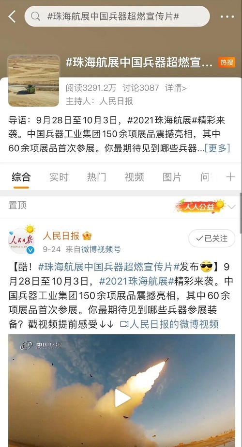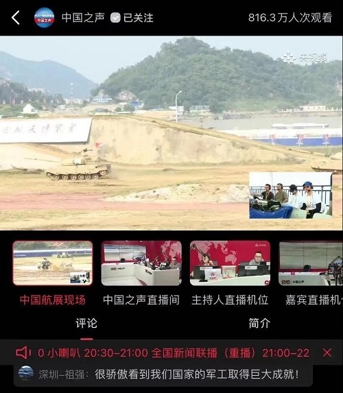 人民日?qǐng)?bào)、新華社、中國(guó)日?qǐng)?bào)、共青團(tuán)中央、國(guó)資小新、騰訊軍事、鳳凰軍事、新浪軍事等新媒體發(fā)布的集團(tuán)公司航展宣傳片等視頻作品燃爆全網(wǎng),閱讀量突破三千萬(wàn)人次,得到外交部發(fā)言人趙立堅(jiān)轉(zhuǎn)載點(diǎn)贊。集團(tuán)公司微信、微博、抖音號(hào)、微信視頻號(hào)等新媒體宣傳片播放閱讀量超過(guò)400萬(wàn)人次。同時(shí),央視新聞、新華社、中國(guó)之聲、央視軍事、央視新媒體、解放軍報(bào)、共青團(tuán)中央、國(guó)資小新、環(huán)球時(shí)報(bào)等多家媒體對(duì)集團(tuán)公司靜、動(dòng)態(tài)展區(qū)進(jìn)行現(xiàn)場(chǎng)直播,在電視端、客戶端、微信視頻號(hào)、微博、B站、快手、抖音等平臺(tái)受到高度關(guān)注。著名軍事專(zhuān)家杜文龍、央視主持人顧國(guó)寧、央廣中國(guó)之聲主持人王藝等直播兵器館、動(dòng)態(tài)表演區(qū)裝備。
