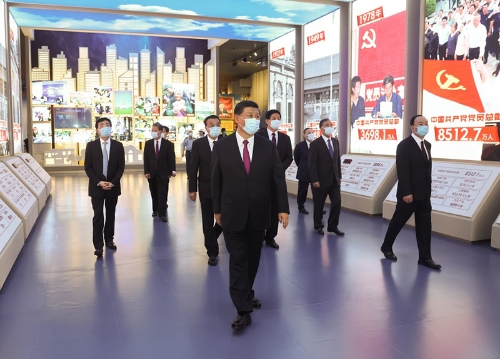 新近落成的中國(guó)共產(chǎn)黨歷史展覽館巍然矗立,氣勢(shì)恢宏。下午3時(shí)20分許,習(xí)近平等黨和國(guó)家領(lǐng)導(dǎo)同志來(lái)到這里,步入展廳參觀展覽。展覽以“不忘初心、牢記使命”為主題,精心設(shè)計(jì)了“建立中國(guó)共產(chǎn)黨 奪取新民主主義革命偉大勝利”、“成立中華人民共和國(guó) 進(jìn)行社會(huì)主義革命和建設(shè)”、“實(shí)行改革開(kāi)放 開(kāi)創(chuàng)和發(fā)展中國(guó)特色社會(huì)主義”、“推進(jìn)中國(guó)特色社會(huì)主義進(jìn)入新時(shí)代 全面建成小康社會(huì) 開(kāi)啟全面建設(shè)社會(huì)主義現(xiàn)代化國(guó)家新(人民日?qǐng)?bào))征程”4個(gè)部分,通過(guò)2600余幅圖片、3500多件套文物實(shí)物,第一次全方位、全過(guò)程、全景式、史詩(shī)般展現(xiàn)中國(guó)共產(chǎn)黨波瀾壯闊的百年歷程,濃墨重彩地反映黨的不懈奮斗史、不怕?tīng)奚?、理論探索史、為民造福史、自身建設(shè)史,使人們深刻認(rèn)識(shí)到紅色政權(quán)來(lái)之不易、新中國(guó)來(lái)之不易、中國(guó)特色社會(huì)主義來(lái)之不易,深刻認(rèn)識(shí)到中國(guó)共產(chǎn)黨為什么能、馬克思主義為什么行、中國(guó)特色社會(huì)主義為什么好。