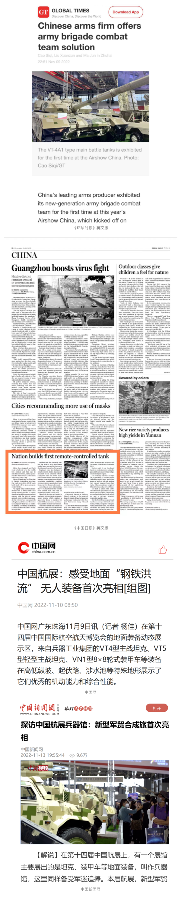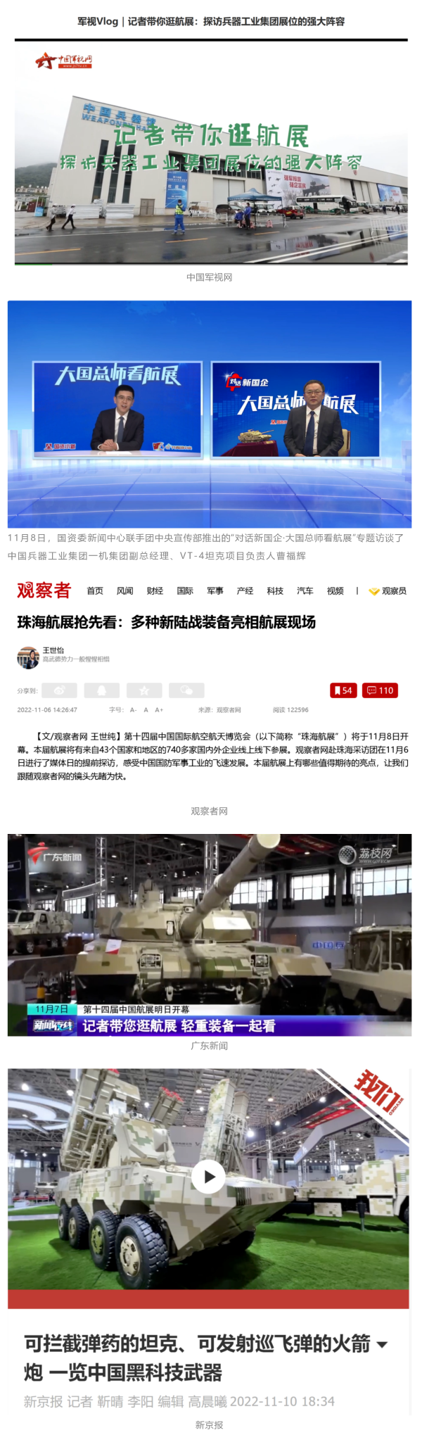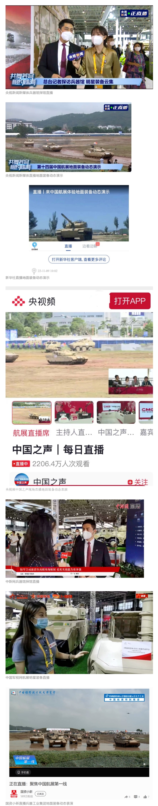 央視國防軍事頻道航展特別報(bào)道《炫舞天地間》11月12日《賞“鐵甲雄風(fēng)”!看航展地面裝備“鋼鐵洪流”名場面》對(duì)兵器工業(yè)集團(tuán)武器裝備特色亮點(diǎn)進(jìn)行報(bào)道?!秶儡娛略鐖?bào)》11月7日推出報(bào)道《第十四屆中國國際航空航天博覽會(huì)明天開幕 中國兵器館首次以陸軍合成旅實(shí)戰(zhàn)體系形式展出》,對(duì)兵器館陸軍合成旅實(shí)戰(zhàn)體系進(jìn)行報(bào)道?!盾娛聢?bào)道》11月9日推出《第十四屆中國國際航空航天博覽會(huì) 地面兵器裝備首次聯(lián)合陸航直升機(jī)進(jìn)行動(dòng)態(tài)展示》報(bào)道。《軍迷行天下》11月9日推出報(bào)道《軍迷打卡航展2022》以專業(yè)軍迷視角探館兵器館,全面展示兵器工業(yè)集團(tuán)參展裝備特色亮點(diǎn)。
