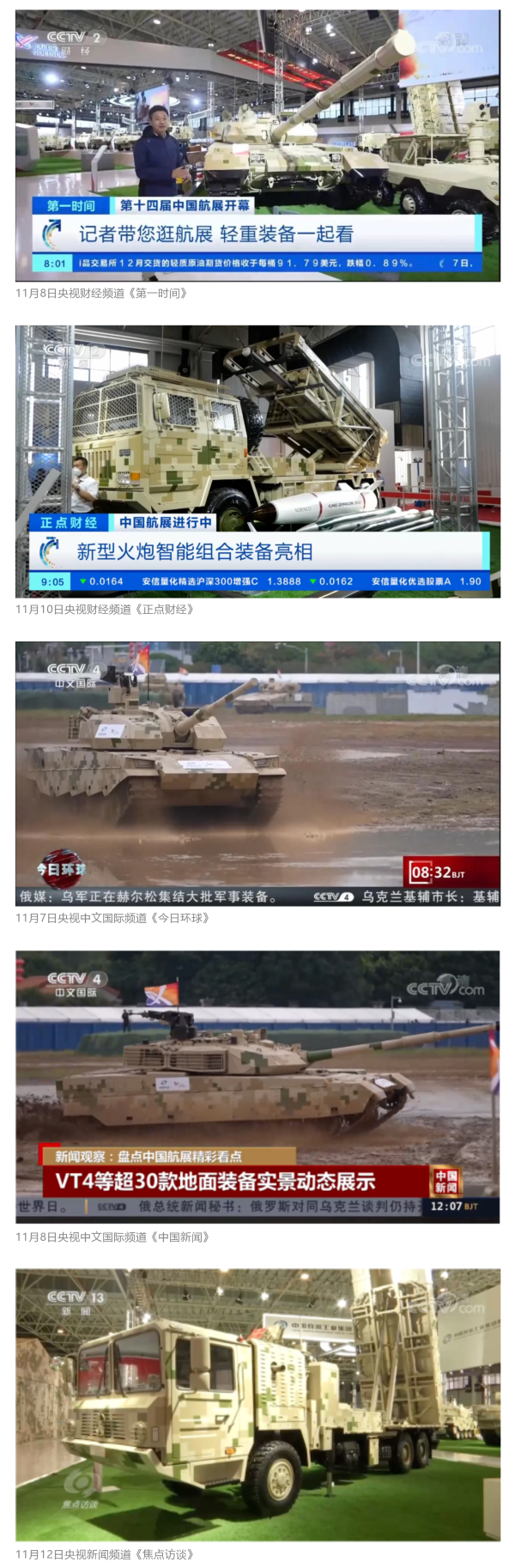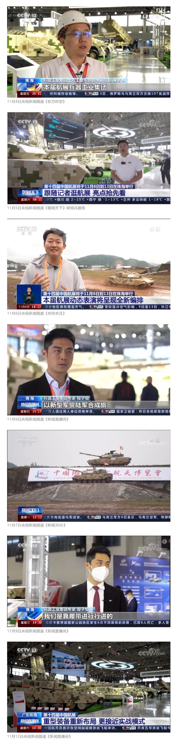 此次航展,央視新聞?lì)l道《朝聞天下》《新聞直播間》《東方時(shí)空》《共同關(guān)注》《新聞30分》《24小時(shí)》、央視國防軍事頻道《國防軍事早報(bào)》《軍事報(bào)道》《軍迷行天下》、央視國際頻道《中國新聞》《今日環(huán)球》等欄目共播出兵器工業(yè)集團(tuán)參展相關(guān)新聞報(bào)道30余條。