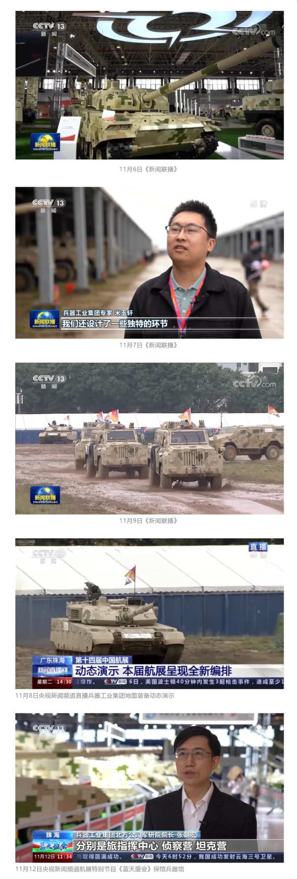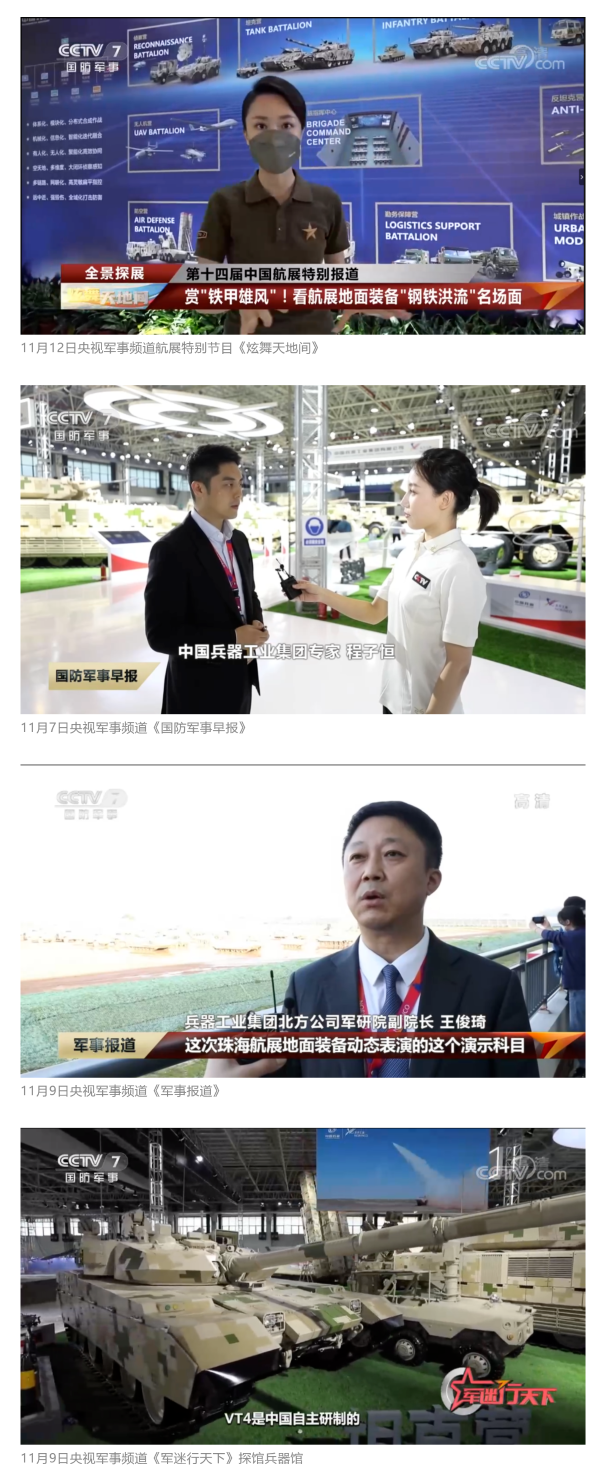 11月6日、7日、9日,央視《新聞聯(lián)播》三次報(bào)道兵器工業(yè)集團(tuán)參展情況,重點(diǎn)介紹了集團(tuán)公司總體參展情況、地面裝備動(dòng)態(tài)演示全新編排、國產(chǎn)輪式反伏擊車首次采用有人駕駛和無人駕駛混合編隊(duì)等內(nèi)容。11月8日,央視新聞?lì)l道直播地面裝備動(dòng)態(tài)演示;11月12日,央視新聞?lì)l道航展特別報(bào)道《藍(lán)天盛會(huì)》探訪兵器館,采訪兵器工業(yè)集團(tuán)嘉賓對(duì)陸軍合成旅作了報(bào)道。
