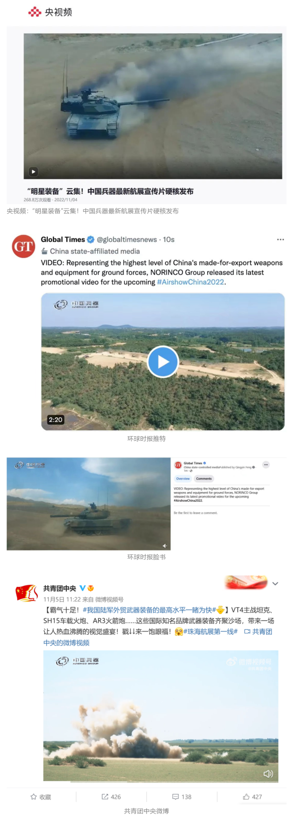 人民日?qǐng)?bào)官方微博、微信公眾號(hào),新華社客戶端、央視新聞客戶端、中國日?qǐng)?bào)微博、參考消息微信公眾號(hào)、解放軍報(bào)微博、央視軍事微博、CGTN微博、中國軍號(hào)微博、共青團(tuán)中央微博、環(huán)球時(shí)報(bào)(英文網(wǎng)站、臉書賬號(hào)、推特賬號(hào))、嗶哩嗶哩、學(xué)習(xí)強(qiáng)國平臺(tái)、國資小新視頻號(hào)、網(wǎng)易軍事、騰訊軍事、鳳凰軍事、北京日?qǐng)?bào)、東方衛(wèi)視看看新聞全媒體、北京電視臺(tái)等20余家中央主流媒體、國家部委、省市媒體的新媒體第一時(shí)間播發(fā)集團(tuán)公司航展宣傳片等視頻作品燃爆全網(wǎng),累計(jì)閱讀量突破1700萬人次。集團(tuán)公司微信公眾號(hào)、微博、抖音號(hào)、快手號(hào)、微信視頻號(hào)、知乎號(hào)等新媒體宣傳片播放閱讀量超過800萬人次,點(diǎn)贊超過30萬人次。集團(tuán)公司微信公眾號(hào)推出《硬核!中國兵器最新航展宣傳片發(fā)布》《中國兵器航展節(jié)目單,請(qǐng)選出心中明星裝備》《航展首日,中國兵器閃耀亮相!》等7篇報(bào)道,閱讀量超過25萬人次,集團(tuán)公司微信視頻號(hào)、抖音號(hào)、快手號(hào)等新媒體賬號(hào)發(fā)布“中國兵器航展大秀”系列視頻,觀看量超過330萬人次。