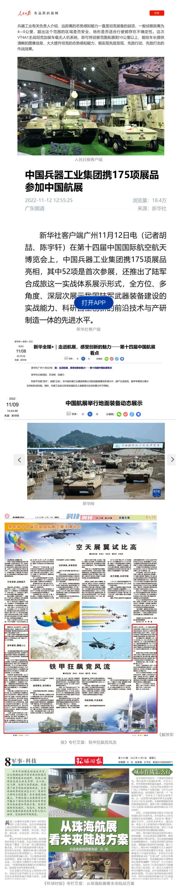 人民日?qǐng)?bào)客戶端、新華社客戶端、新華網(wǎng)、央視新聞客戶端、《解放軍報(bào)》、《環(huán)球時(shí)報(bào)》、《中國日?qǐng)?bào)》、中國網(wǎng)、人民網(wǎng)、中國新聞網(wǎng)、央視網(wǎng)、央廣網(wǎng)、中國軍視網(wǎng)、中國之聲,圖片中國、觀察者網(wǎng)、鳳凰網(wǎng)、新浪網(wǎng)、搜狐網(wǎng)、網(wǎng)易網(wǎng)、今日頭條等中央主流媒體和知名網(wǎng)絡(luò)媒體以及南方日?qǐng)?bào)、廣東衛(wèi)視、廣東新聞、北京時(shí)間、新京報(bào)、珠海電視臺(tái)、看看新聞等省市媒體對(duì)集團(tuán)公司參展情況進(jìn)行了濃墨重彩的圖片、文字、視頻報(bào)道。