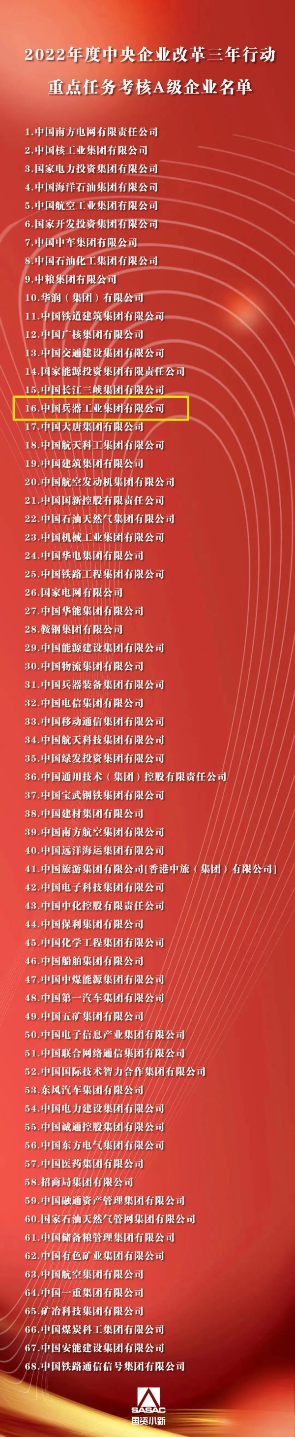 根據(jù)《中央企業(yè)改革三年行動(dòng)重點(diǎn)任務(wù)考核實(shí)施方案(試行)》和《中央企業(yè)改革三年行動(dòng)重點(diǎn)任務(wù)考核指標(biāo)表(2022版)》,經(jīng)審定,國(guó)務(wù)院國(guó)資委發(fā)布2022年度中央企業(yè)改革三年行動(dòng)重點(diǎn)任務(wù)考核A級(jí)企業(yè)名單,中國(guó)兵器工業(yè)集團(tuán)有限公司獲評(píng)A級(jí)。 來源/國(guó)資委網(wǎng)站 |