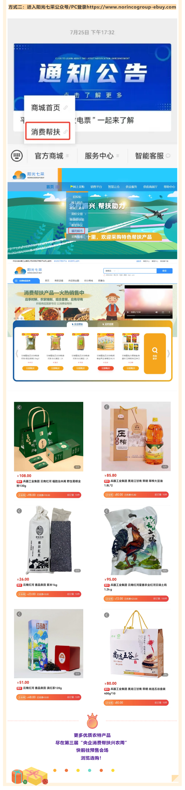 百家央企聚合力 消費幫扶促振興 第三屆“央企消費幫扶興農(nóng)周” 預(yù)售已啟動 8月30日 興農(nóng)周活動將正式開啟 “央企消費幫扶興農(nóng)周”由國務(wù)院國資委社會責(zé)任局指導(dǎo),央企消費幫扶電商平臺(國網(wǎng)數(shù)字科技控股有限公司)主辦,國務(wù)院國資委機關(guān)服務(wù)管理局、國務(wù)院國資委新聞中心、國網(wǎng)北京市電力公司、各中央企業(yè)電商平臺聯(lián)合協(xié)辦。 活動以“央企攜手,興農(nóng)惠民”為主題,組織動員中央企業(yè)所屬各單位各部門(特別是工會、食堂)、廣大干部職工、上下游供應(yīng)商和業(yè)務(wù)合作伙伴采購幫扶縣的優(yōu)質(zhì)農(nóng)產(chǎn)品,促進脫貧地區(qū)產(chǎn)業(yè)發(fā)展和脫貧群眾穩(wěn)定增收,鞏固拓展脫貧攻堅成果。 預(yù)售活動火熱開啟 為方便大家提前選購 此次預(yù)售期升級為10天 (8月20日-8月29日) 誠邀下單 兵器工業(yè)集團定點幫扶 黑龍江甘南縣、云南紅河縣 農(nóng)特產(chǎn)品! 8月30日-9月5日 請鎖定“央企館-兵器工業(yè)集團” 我們一起共譜鄉(xiāng)村振興新篇章! |