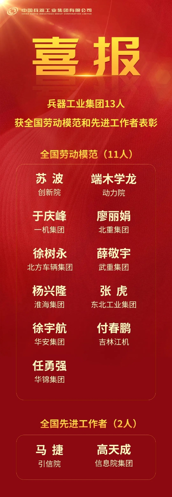 兵器工業(yè)集團(tuán)13人獲全國勞動模范和先進(jìn)工作者表彰 |